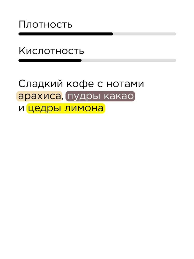 Сладкий кофе с нотами арахиса, пудры какао и цедры лимона.